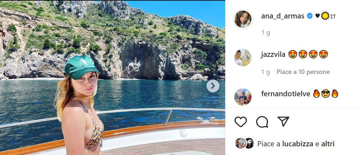 Ana de Armas, l’affascinante e temibile Paloma, agente della Cia sotto copertura Paloma dell’ultimo film della saga di James Bond ‘No Time to Die’, impazzisce per il cibo e il mare italiano. In una serie di foto su Instagram, l’attrice cubana naturalizzata spagnola, conosciuta anche per aver recitato in ‘Deep Water’ (al fianco dell’ex fidanzato Ben Affleck) e in ‘Blade Runner 2049’, ha documentato la sua vacanza tra Positano e Capri, con gite su un gozzo ai Faraglioni e storie di Instagram dedicate alle delizie della cucina campana, a partire dalla pizza, accompagnate da musica a tema, tra ‘Buongiorno a te’ di Luciano Pavarotti e ‘Funiculì funicolà’.