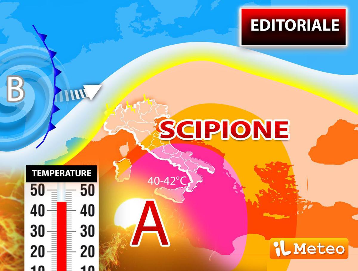 Tendenza. L’anticiclone africano Scipione porta l’apice del caldo Domenica 5 con picchi fino a 43°C. Temporali forti in arrivo in serata al Nord, calo termico diffuso con la nuova settimana salvo valori molto alti residui al Sud ancora Lunedì 6 Giugno.