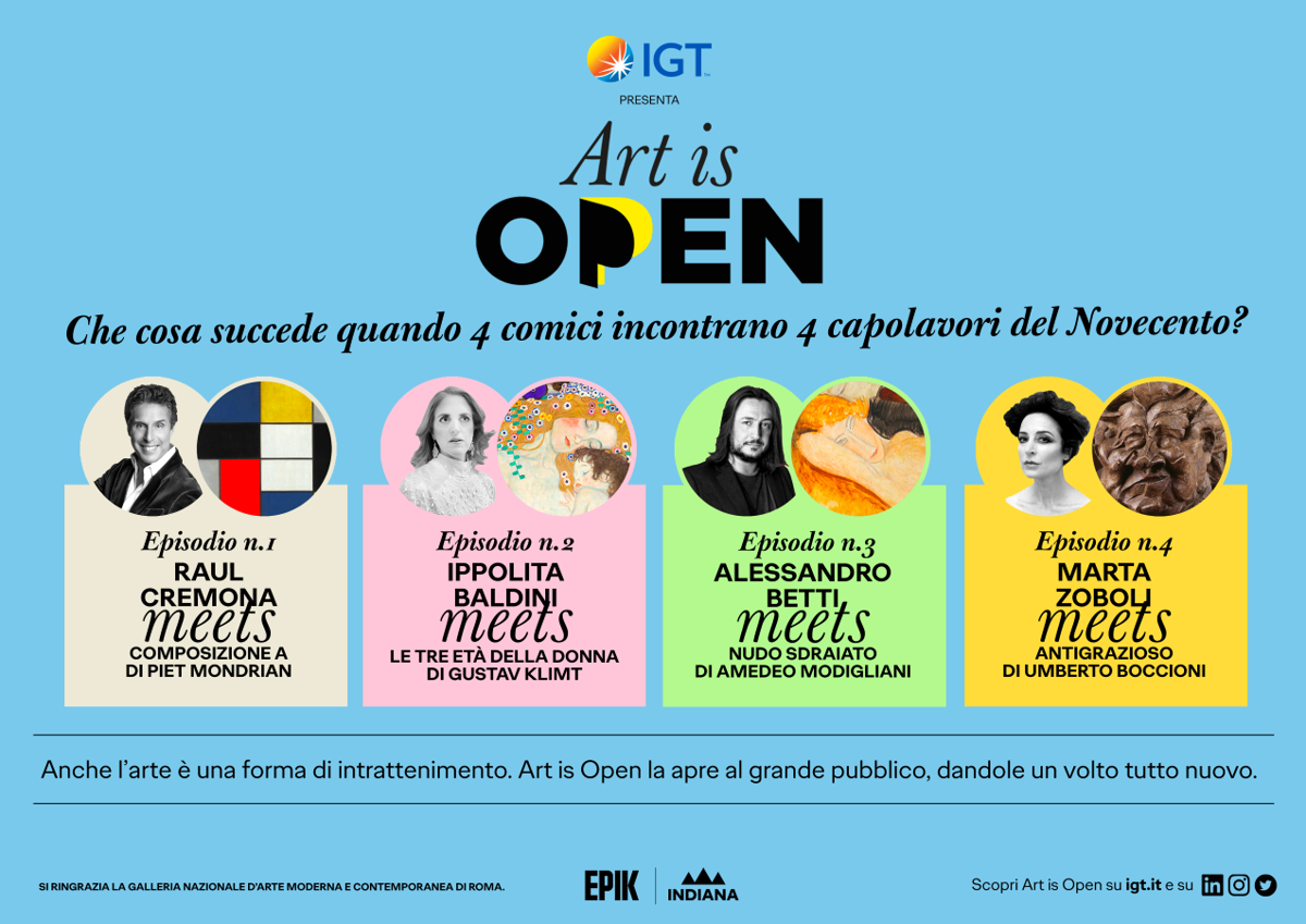Gli attori chiamati a spiegare e interpretare alcuni capolavori rispettivamente dei maestri Piet Mondrian, Gustav Klimt, Amedeo Modigliani e Umberto Boccioni esposti alla Galleria Nazionale d’Arte Moderna e Contemporanea di Roma, hanno scritto e confezionato quattro monologhi girati all’interno del museo, aperto in via eccezionale anche nelle ore notturne. Al centro del format “Art is Open” ideato da Epik e prodotto da Indiana Production vi è il concetto di accessibilità all’arte e non solo: ogni interprete legandosi a un’opera ha declinato nella propria performance comica i grandi temi del sociale su cui Igt è impegnata.