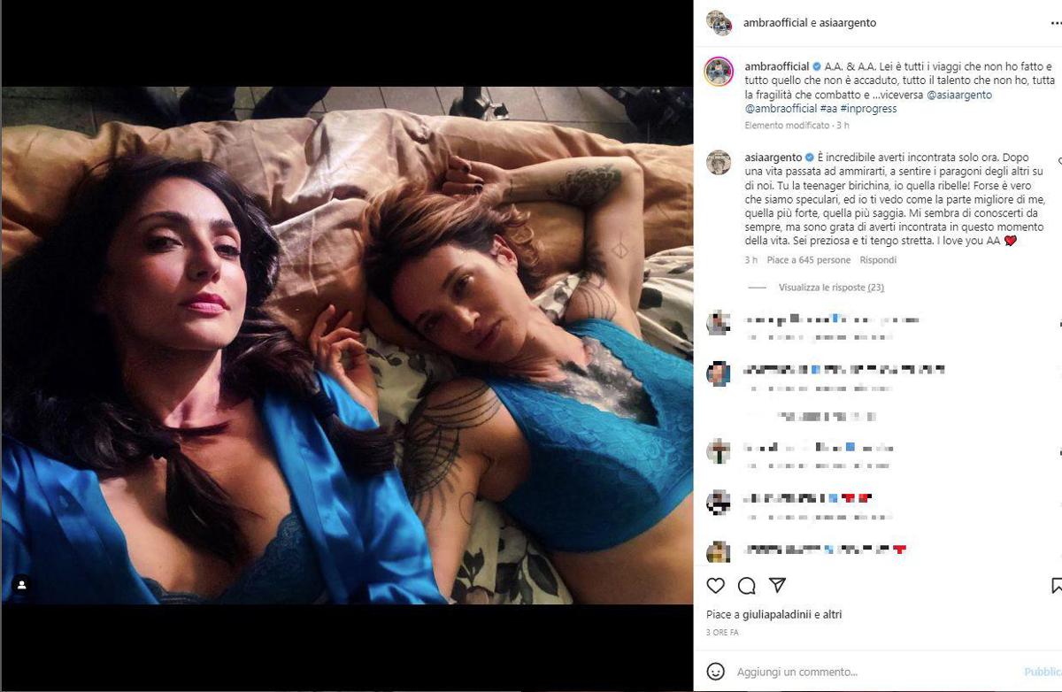 (Adnkronos) – Ambra e Asia. Asia e Ambra. Con un post identico sui social Ambra Angiolini e Asia Argento annunciano un progetto che vede insieme. “A.A. & A.A. Lei è tutti i viaggi che non ho fatto e tutto quello che non è accaduto, tutto il talento che non ho, tutta la fragilità che combatto e …viceversa”, scrivono entrambe sui profili Instagram ufficiali accanto ad una foto che le ritrae sdraiate accanto su un letto. L’hashtag è #inprogress. Il progetto non è annunciato ma – a quanto apprende l’Adnkronos – le due attrici sono protagoniste insieme di una nuova serie televisiva, che potrebbe approdare su Amazon Prime, le cui riprese sarebbero iniziate in questi giorni. Ancora top secret il titolo, la storia e il resto del cast.