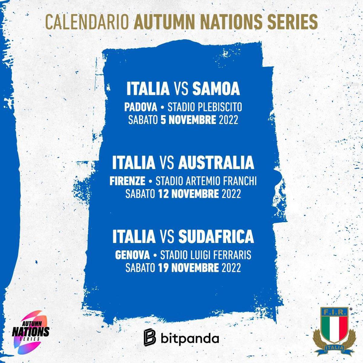 Calendario Autumn Nations Series 2022: Italia-Samoa, sabato 5 novembre ore 14 – Padova, Stadio Plebiscito. Italia-Australia, sabato 12 novembre ore 14 – Firenze, Stadio “Artemio Franchi”. Italia-Sudafrica, sabato 19 novembre ore 14 – Genova, Stadio “Luigi Ferraris”.