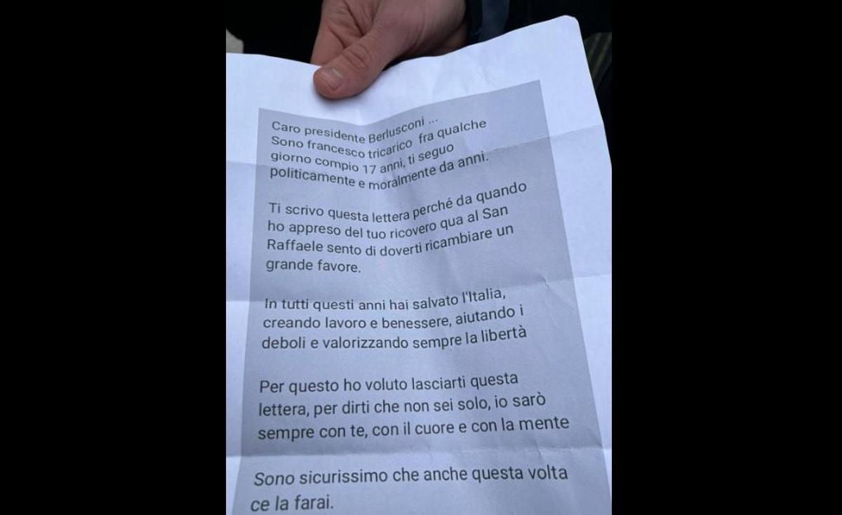 Nella lettera scritta dal giovane si legge: “Caro presidente Berlusconi, sono Francesco T. Fra qualche giorno compio 17 anni. Ti seguo politicamente e moralmente da anni. Ti scrivo questa lettera perché da quando ho appreso del tuo ricovero qua al San Raffaele sento di doverti ricambiare un grande favore: in tutti questi anni hai salvato l’Italia creando lavoro e benessere, aiutando i deboli e valorizzando sempre la libertà”. Per questo, conclude la missiva, “ho voluto lasciarti questa lettera: per dirti che non sei solo, io sarò sempre con te con il cuore, con la mente, sono sicurissimo che anche questa volta ce la farai”.