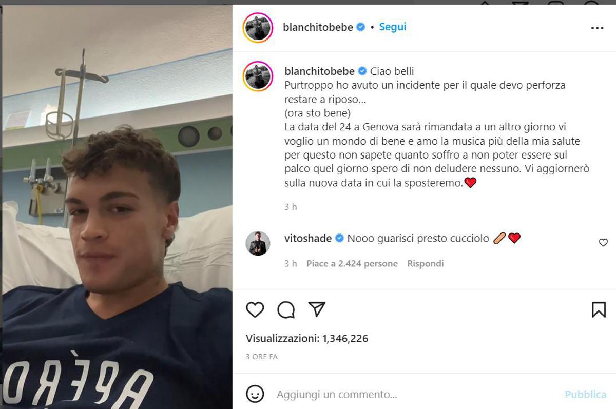 (Adnkronos) – “Purtroppo ho avuto un incidente per il quale devo per forza restare a riposo… (ora sto bene)”. Così Blanco su Instragram. Il giovane artista bresciano, che ha vinto Sanremo 2022 insieme a Mahmood con ‘Brividi, ha pubblicato anche un video che lo ritrae in ospedale sdraiato sul letto. “La data del 24 a Genova sarà rimandata a un altro giorno”, riferendosi a un concerto che avrebbe dovuto tenere nel capoluogo ligure. “Vi voglio un mondo di bene e amo la musica più della mia salute per questo non sapete quanto soffro a non poter essere sul palco quel giorno spero di non deludere nessuno – scrive ancora – Vi aggiornerò sulla nuova data in cui la sposteremo”.