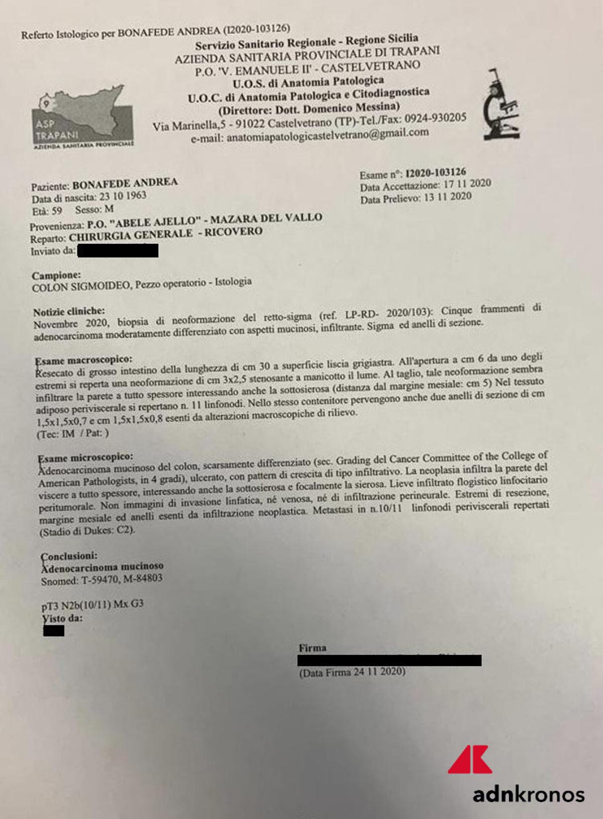 (Adnkronos) – Il boss mafioso Matteo Messina Denaro è affetto da un “Adenocarcinoma mucinoso del colon”, cioè una forma tumorale aggressiva che attacca il colon. Ecco quanto si legge nella cartella clinica, a firma del dottor Michele Spicola, patologo dirigente dell’Azienda sanitaria provinciale di Trapani, presso l’Ospedale Vittorio Emanuele Secondo di Castelvetrano (Trapani), sua città natale. E’ il 24 novembre del 2020, in piena pandemia, quando il medico, come si legge nella cartella in possesso dell’Adnkronos, scrive il referto istologico per Messina Denaro, alias Andrea Bonafede, il nome con cui il boss era in cura. La data di accettazione è il 17 novembre del 2020 e la data del prelievo il 13 novembre del 2020. Il tumore di cui è affetto Messina Denaro è aggressivo “ulcerato, con pattern di crescita di tipo infiltrativo”. “La neoplasia – si legge -infiltra la parete delle viscere a tutto spessore, interessando anche la sottosierosa e focalmente la sierosa”.