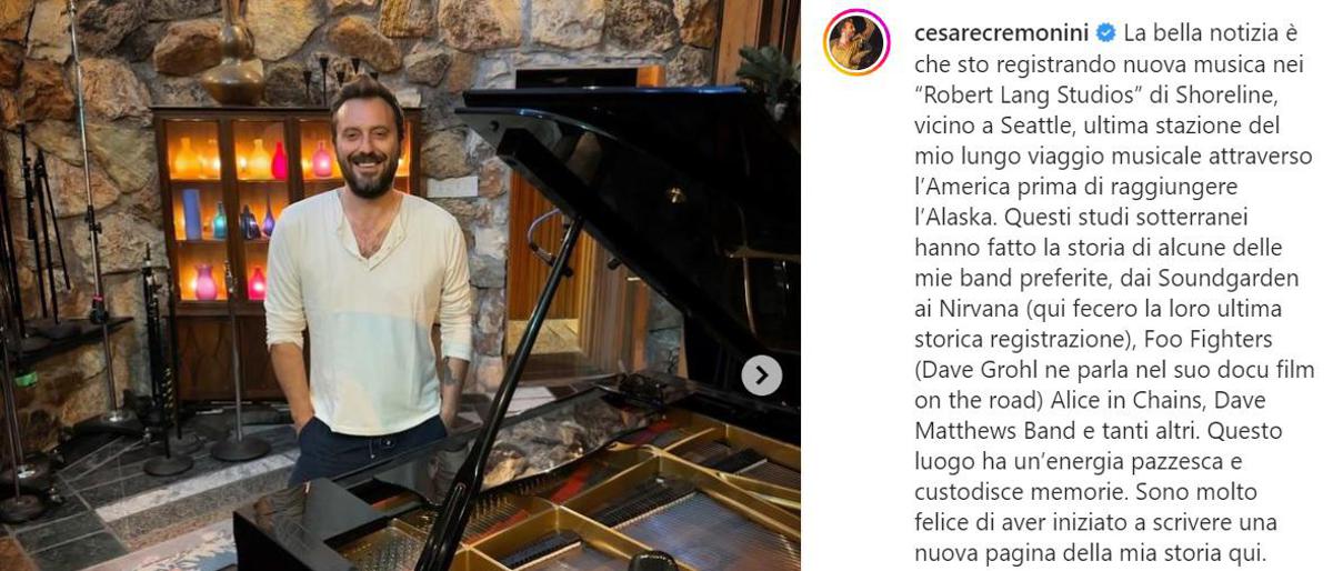 “La bella notizia – scrive Cremonini accanto ad una foto che lo ritrae nei leggendari studi accanto ad un pianoforte a coda – è che sto registrando nuova musica nei ‘Robert Lang Studios’ di Shoreline, vicino a Seattle, ultima stazione del mio lungo viaggio musicale attraverso l’America prima di raggiungere l’Alaska. Questi studi sotterranei hanno fatto la storia di alcune delle mie band preferite, dai Soundgarden ai Nirvana (qui fecero la loro ultima storica registrazione), Foo Fighters (Dave Grohl ne parla nel suo docu film on the road) Alice in Chains, Dave Matthews Band e tanti altri. Questo luogo ha un’energia pazzesca e custodisce memorie. Sono molto felice di aver iniziato a scrivere una nuova pagina della mia storia qui. Oggi, nel giorno del compleanno di Kurt Cobain, si respirava qualcosa di unico. Ho registrato pianoforti, voci, chitarre e bassi di canzoni nate in questo periodo in totale libertà. Si dice sia abitato anche da alcuni fantasmi… Io mi sto trovando molto bene! Vi abbraccio, tutti”, conclude.