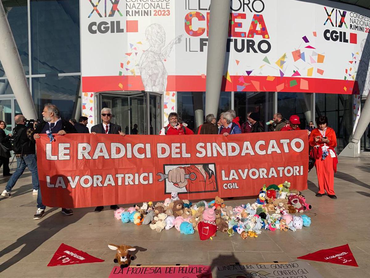 E oggi, in vista dell’arrivo del premier, sono apparsi un centinaio di peluche colorati guidati da Peppa Pig , già simbolo della protesta Lgbt+ anti Meloni, con al collo un fazzoletto con la scritta “mai più fascismo” davanti a uno striscione che ricorda le ‘Radici del sindacato’ metalmeccanici. Il tutto al suono di bella ciao. E’ questo, richiamando la protesta già messa in atto a Cutro dopo la strage degli immigrati, il cuore del presidio che la minoranza Cgil guidata da Eliana Como sta svolgendo davanti alla porta del Palacongressi. Accanto un secondo striscione ancora più chiaro: ‘Meloni: non nel nostro nome – Cutro: strage di stato!’. Una quarantina di delegati animano la protesta intonando bella ciao e altre canzoni di lotta e srotolando via via altri striscioni contro il governo. ‘Al fianco di chi lotta’, si legge. I peluche troveranno poi posto nelle prime fila dell’immensa platea del Palacongressi appena sotto il palco dal quale parlerà Meloni: “Una sorta di memento”, spiegano gli organizzatori che comunque lasceranno la sala per non ascoltare l’intervento del premier.