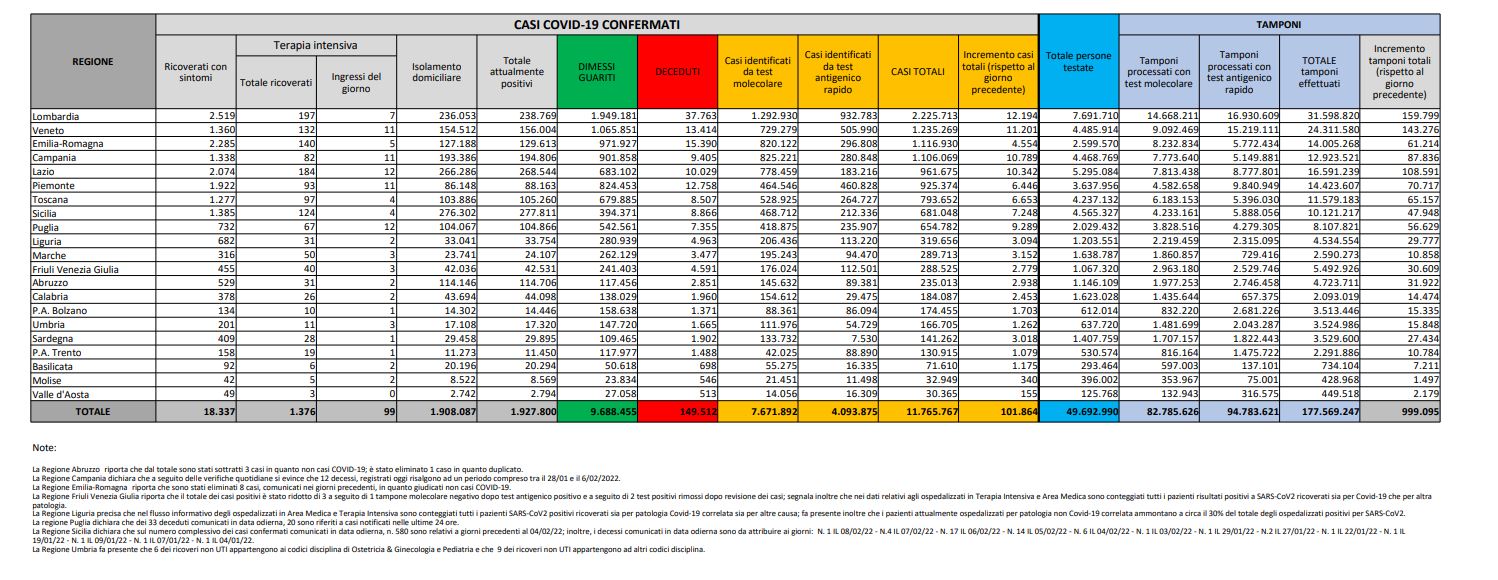 Tamponi fatti oggi: 999.095