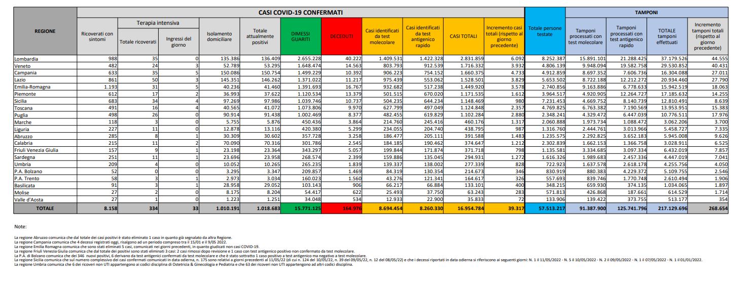 Tamponi fatti oggi: 268.654