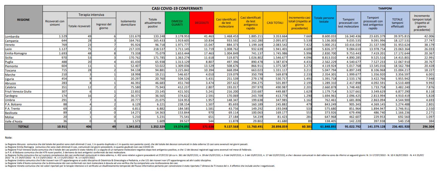 Tamponi fatti oggi: 296.304
