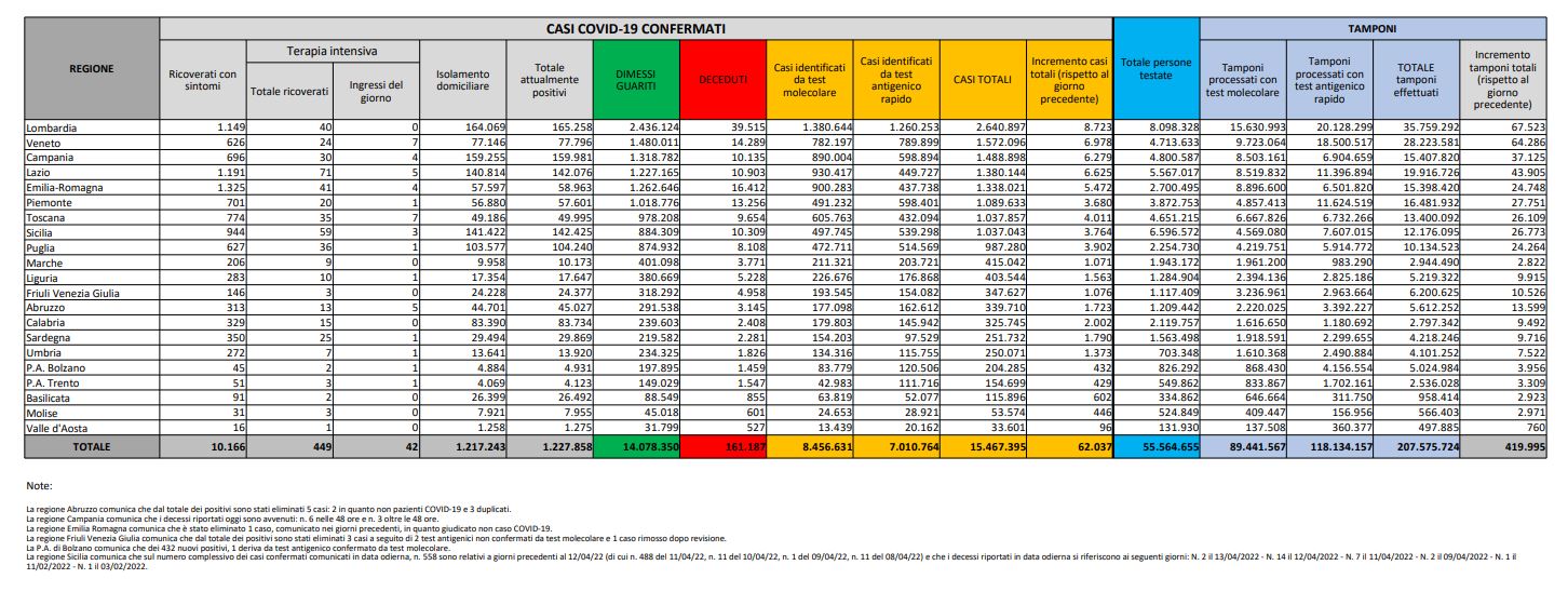 Tamponi fatti oggi: 419.995