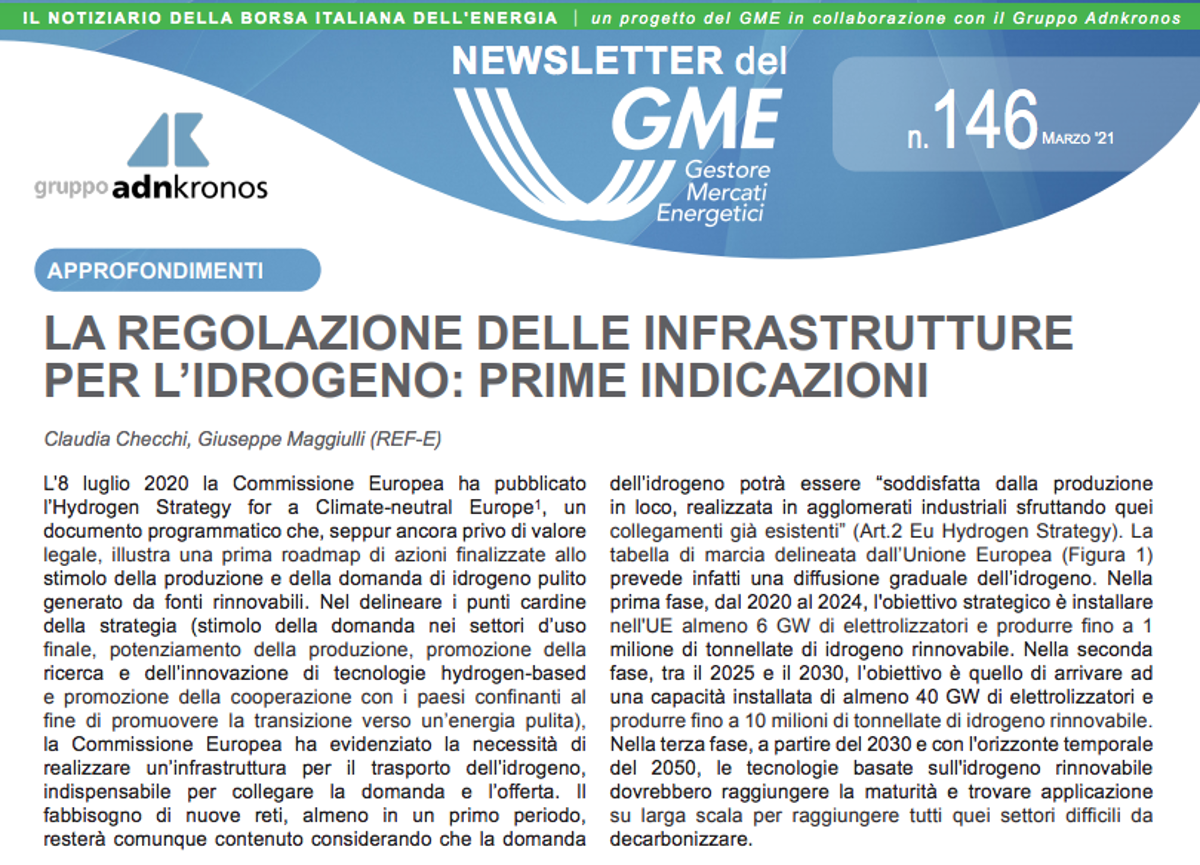 È online, scaricabile dal sito www.mercatoelettrico.org, il nuovo numero della newsletter del Gestore dei Mercati Energetici (Gme). La newsletter si apre con un intervento di Claudia Checchi e Giuseppe Maggiulli Ref-E sulle prime indicazioni riguardanti la regolazione delle infrastrutture per l’idrogeno. “L’ 8 luglio 2020 la Commissione Europea ha pubblicato l’Hydrogen Strategy for a Climate-neutral Europe, un documento programmatico che, seppur ancora privo di valore legale, illustra una prima roadmap di azioni finalizzate allo stimolo della produzione e della domanda di idrogeno pulito generato da fonti rinnovabili”, hanno sottolineato gli analisti del Ref-E.
