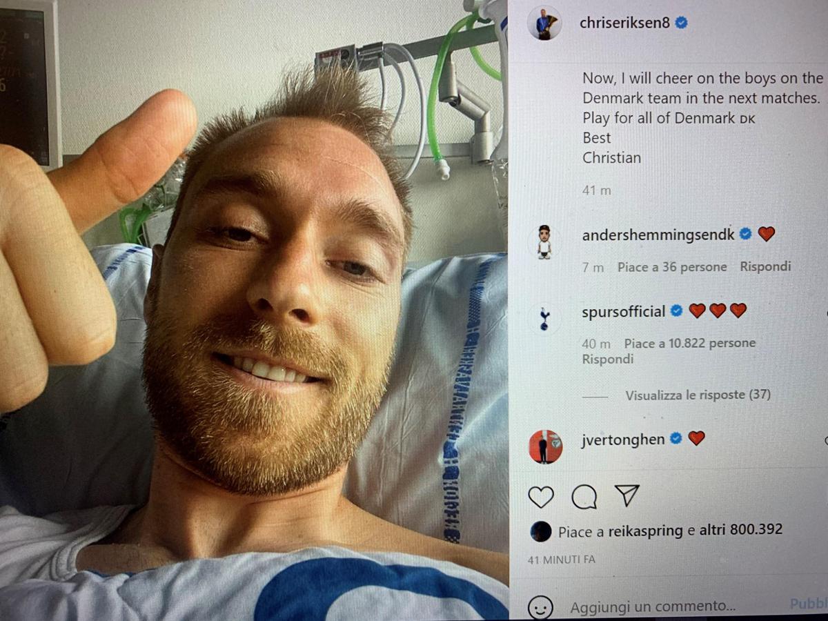 “Ciao a tutti, grazie mille per i vostri affettuosi ed emozionanti messaggi da tutto il mondo. Significa molto per me e la mia famiglia”, si legge nel messaggio di Eriksen, abbinato allo scatto che lo ritrae stanco ma sorridente e con il pollice alzato.