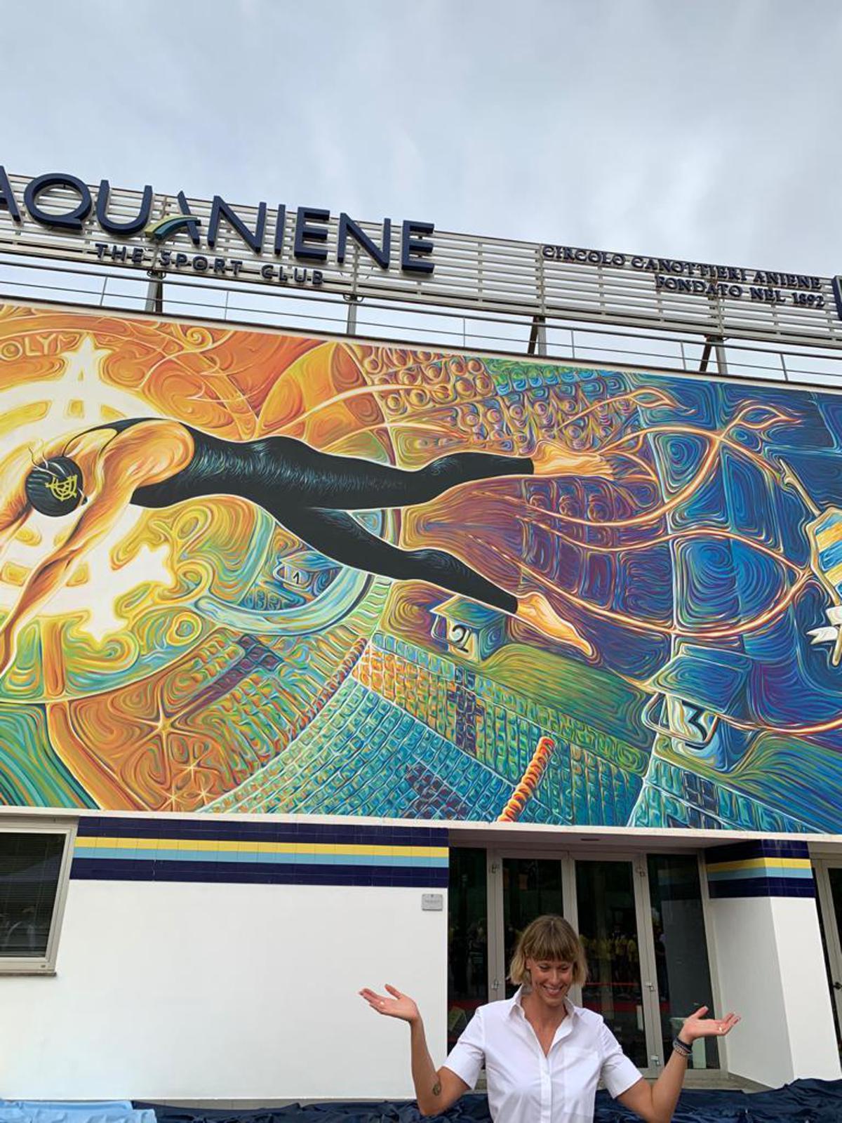 E’ stato svelato il murale dedicato a Federica Pellegrini all’Aquaniene. Un’opera dell’artista multitasking Vanni Mangoni, ex nuotatore, di 17 metri per 7 di altezza dal titolo ‘Dimensione Divina’. L’opera ritrae una delle immagini simbolo della ‘Divina’, il tuffo nel record del mondo. “Volevo un dipinto vibrante”, ha raccontato l’artista. “Voglio dire grazie alla famiglia Aniene per il supporto, per la fiducia per questo lavoro, la folle idea di questo murale con un pennello da 3 centimetri. Grazie a Federica per le gioie e le emozioni dal punto di vista sportivo ed umano”, ha spiegato Vanni Mangoni durante la presentazione dell’opera, dove non è ritratto il viso della campionessa per simboleggiare tutti i campioni dell’Aniene.