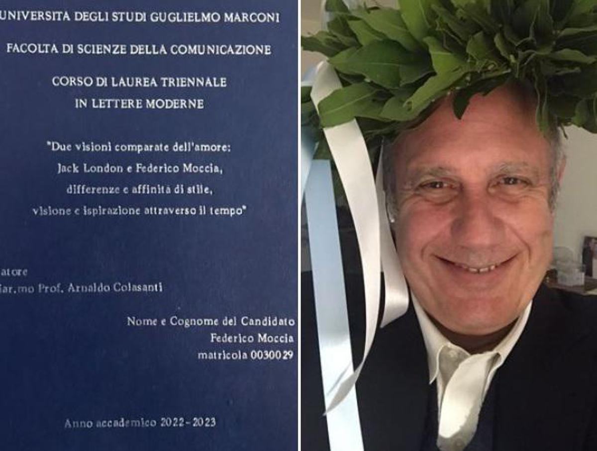 “Voglio condividere con voi questo mio risultato: mi sono laureato in Lettere Moderne! La cosa più bella è stato ringraziare l’autore che mi ha fatto innamorare della scrittura: Jack London con il suo romanzo Martin Eden. Io avevo 13 anni. E dopo tanto tempo l’ho ringraziato in un modo speciale, con la mia tesi: ‘Due visioni comparate dell’amore: Jack London e Federico Moccia, differenze e affinità di stile, visione e ispirazione attraverso il tempo’” scrive sulla sua pagina Facebook condividendo la copertina della sua tesi di laurea all’Università Guglielmo Marconi e una foto sorridente con la corona d’alloro. “E sono contento perché ho trovato dei professori speciali, hanno ascoltato la discussione della mia tesi divertendosi, vedendo le difficoltà di due scrittori che in tempi diversi parlavano d’amore e che all’inizio non hanno trovato una casa editrice e alla fine hanno incontrato il successo”.