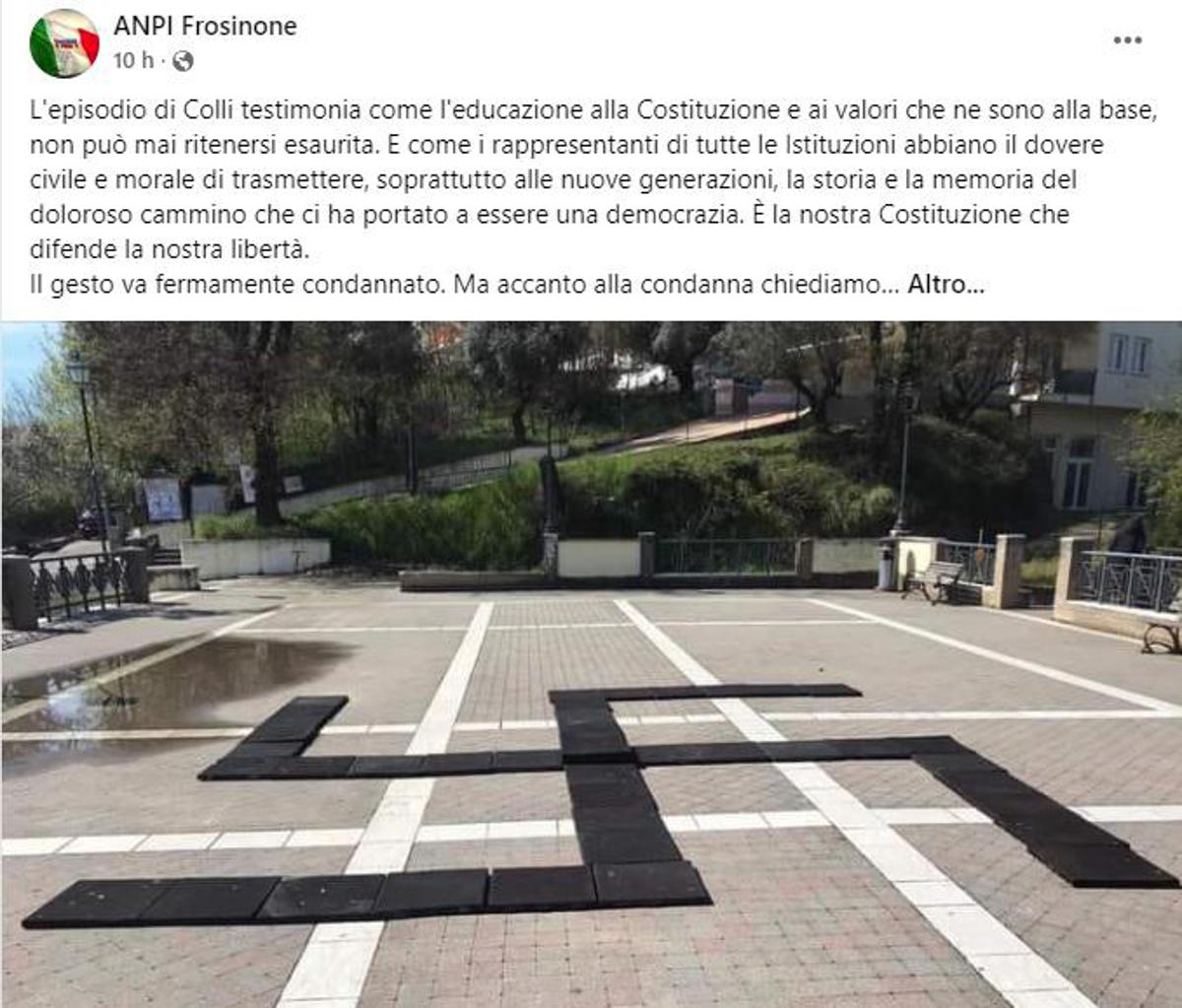 “L’episodio di Colli testimonia come l’educazione alla Costituzione e ai valori che ne sono alla base, non può mai ritenersi esaurita – commenta su Facebook il Coordinamento provinciale Anpi Frosinone – E come i rappresentanti di tutte le Istituzioni abbiano il dovere civile e morale di trasmettere, soprattutto alle nuove generazioni, la storia e la memoria del doloroso cammino che ci ha portato a essere una democrazia. È la nostra Costituzione che difende la nostra libertà. Il gesto va fermamente condannato. Ma accanto alla condanna chiediamo l’impegno di tutte le Istituzioni a ricordare che la Costituzione nasce dalla Resistenza e dall’antifascismo. Dalla lotta contro una dittatura. E a ricordarlo non solo il 25 aprile, ma tutti i giorni. Affinché essa diventi davvero patrimonio di tutti i cittadini”.