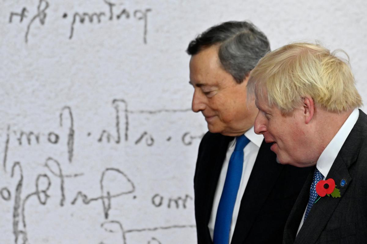 Una volta di fronte, Johnson e Draghi hanno prima accennato una stretta di mano, andata male dopo qualche tentennamento. Allora hanno tentato di far incontrare le nocche, inutilmente. Alla fine è stato il premier britannico a uscire dall’impasse dando a Draghi un piccolo pugno sulla spalla.