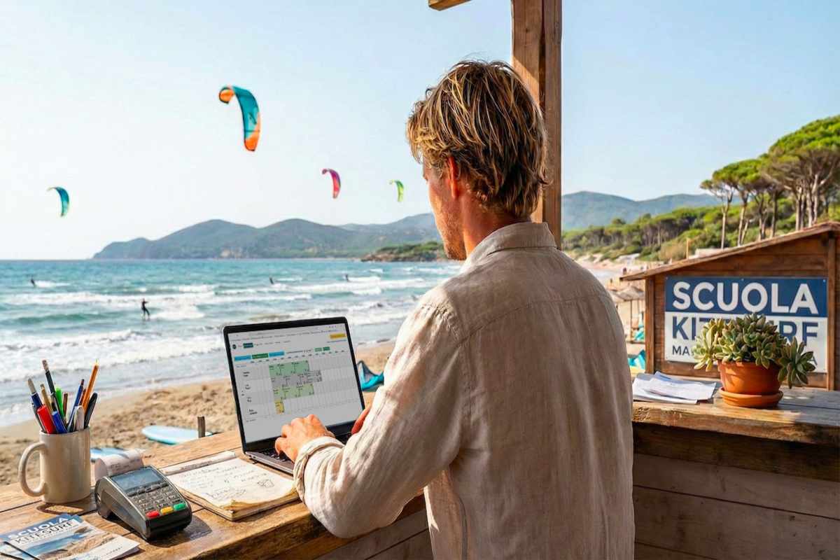 Gestire una scuola di kitesurf o windsurf è un equilibrismo quotidiano su diversi fronti simultanei. Da una parte i corsi da gestire: aperti, ore residue, stato dei pagamenti, progressioni didattiche da tracciare. Dall’altra gli istruttori da coordinare: disponibilità che cambiano, competenze linguistiche da incrociare, compensi da calcolare senza errori. E poi ci sono le prenotazioni: richieste dell’ultimo minuto, cancellazioni per meteo, riprogrammazioni continue. Un gestionale per scuole di kitesurf e windsurf promette di sciogliere questi tre nodi senza aggiungere complessità. La domanda non è se serva, ma quale scegliere e come usarlo per trasformare il caos in controllo.