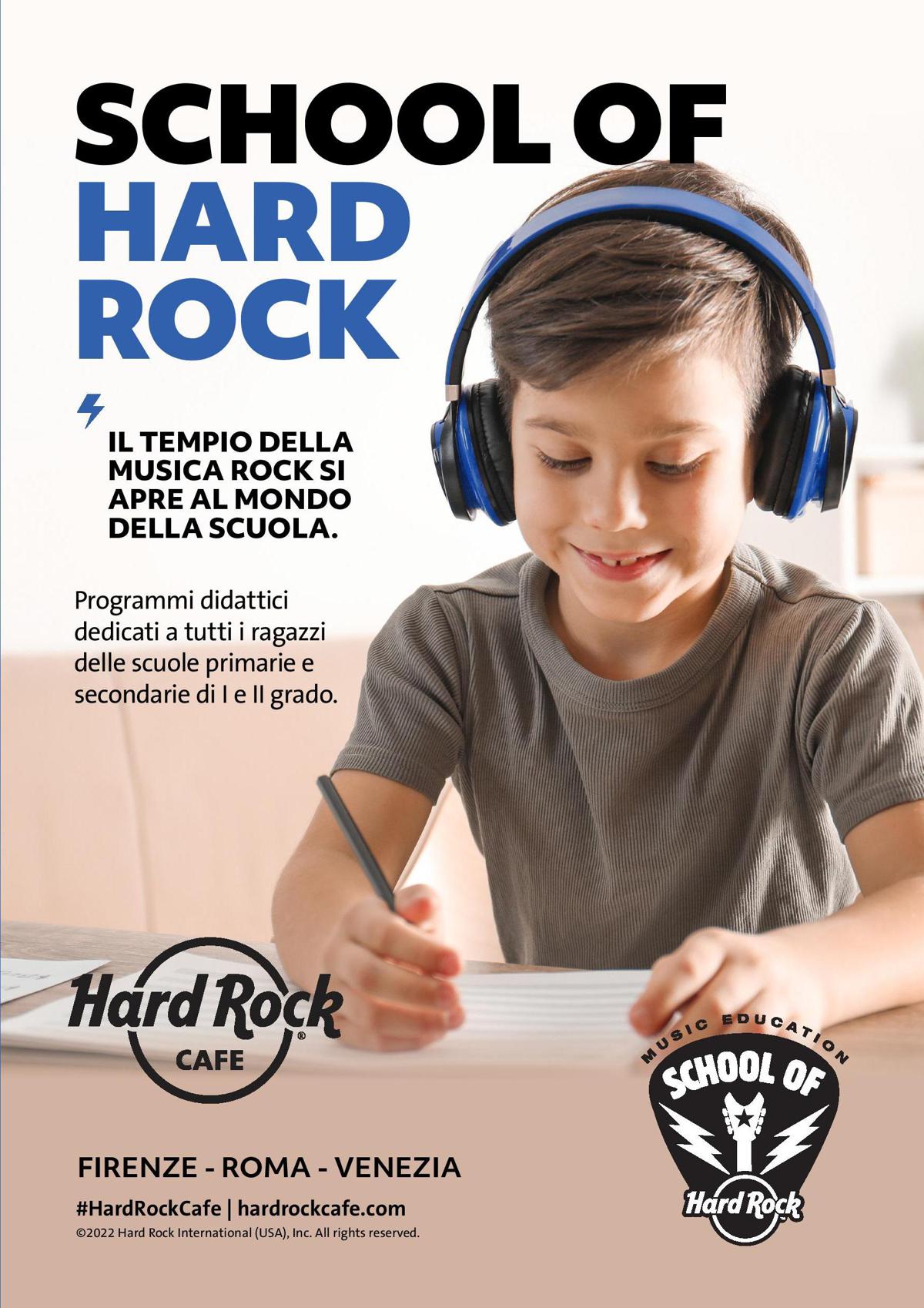 School of Hard Rock è un programma a tutto tondo al servizio delle giovani generazioni, un’autentica esperienza formativa, studiata per essere divertente e interessante, ma anche e soprattutto per far pensare. Il percorso didattico si svolge all’interno dei cafe e accompagna i ragazzi in un viaggio dagli anni Cinquanta fino a oggi, utilizzando la musica e le icone del rock come riflesso dei più importanti cambiamenti sociali, culturali e politici degli ultimi anni, il tutto raccontato con curiosità, video musicali e quiz a premi per stimolare l’interazione, lo scambio e la condivisione, in un mondo sempre più social dove parlare, e parlarsi, diventa fondamentale.