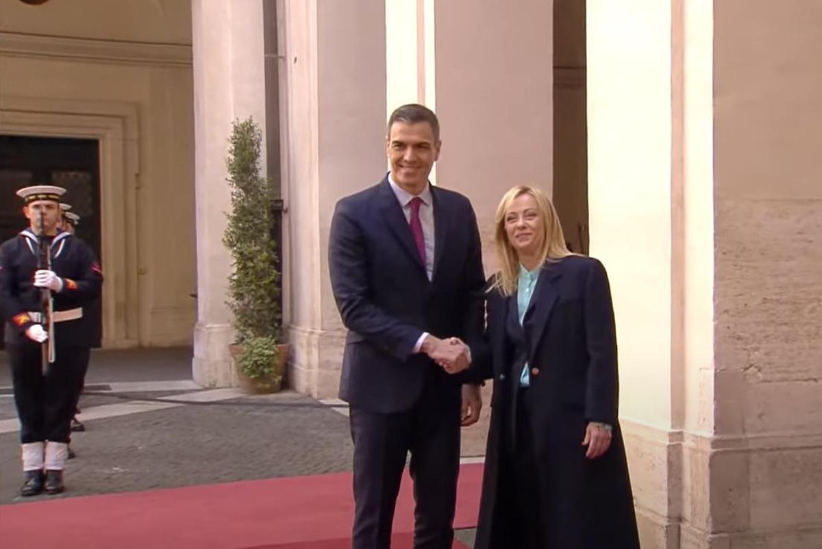 Il presidente Sanchez è stato accolto dalla premier e dal picchetto d’onore, che ha eseguito gli inni nazionali di Spagna e Italia.