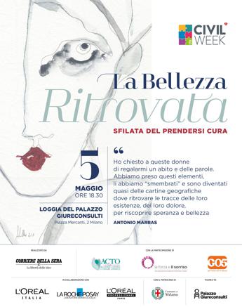Il 5 maggio alle ore 18.30, 31 donne di cui 19 con diagnosi oncologica, sfileranno nella Loggia di Palazzo Giureconsulti, piazza dei Mercanti, a Milano per “La bellezza ritrovata”, la sfilata di Civil Week organizzata da Corriere della Sera-Buone Notizie in collaborazione con L'Oréal Italia, La Roche-Posay, L’Oréal Professionnel Paris e con la partecipazione di ACTO Lombardia, La Forza e il Sorriso Onlus, Go5 Per mano con le donne Onlus. Un evento unico e d’eccezione, 19 donne che stanno affrontando la malattia oncologica, sfileranno davanti al pubblico per raccontare una storia di coraggio e bellezza. A loro si affiancheranno altre donne che porteranno in scena gli abiti disegnati dallo stilista Antonio Marras.