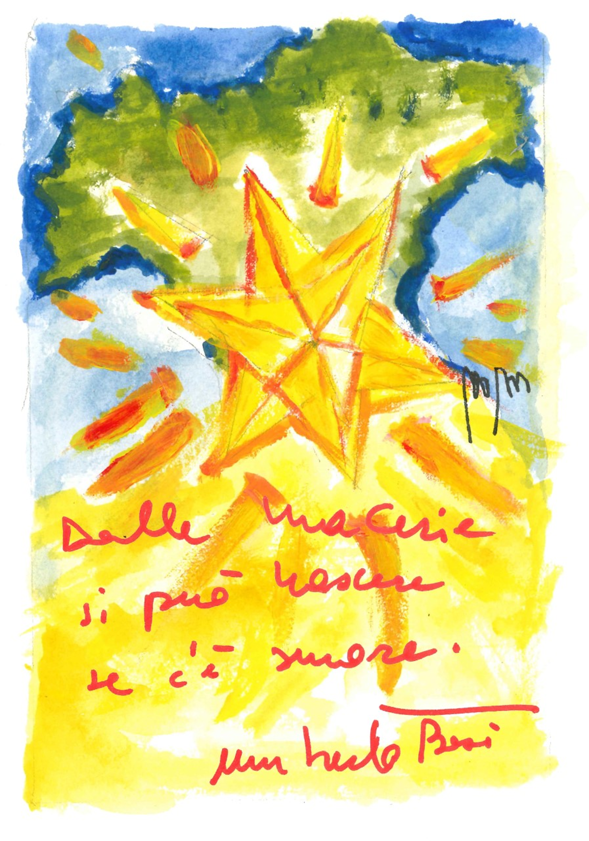 (Adnkronos) – “Dalle macerie si può nascere se c’è amore”. Firmato: Umberto Bossi. E’ il claim della versione 2022, della tradizionale card natalizia che da Gemonio manda Umberto Bossi, a politici e militanti, con l’immancabile cartoncino pitturato dove campeggia la sua frase, che quest’anno esalta la forza dell’amore. Nel dipinto, eseguito con la tecnica della pittura a gouache, dall’artista di sempre – che resta anche per quest’anno senza nome – si prende la scena una gialla stella lucente, che illumina con i suoi raggi le regioni del Nord. “È la stella del Nord. Sempre immutabile”, si legge nel testo che accompagna gli auguri del fondatore della Lega. Una 27esima edizione degli auguri del vecchio capo che confermano così la rinnovata attenzione alla sua Padania, per cui è di nuovo in campo, con il ‘Comitato Nord’.