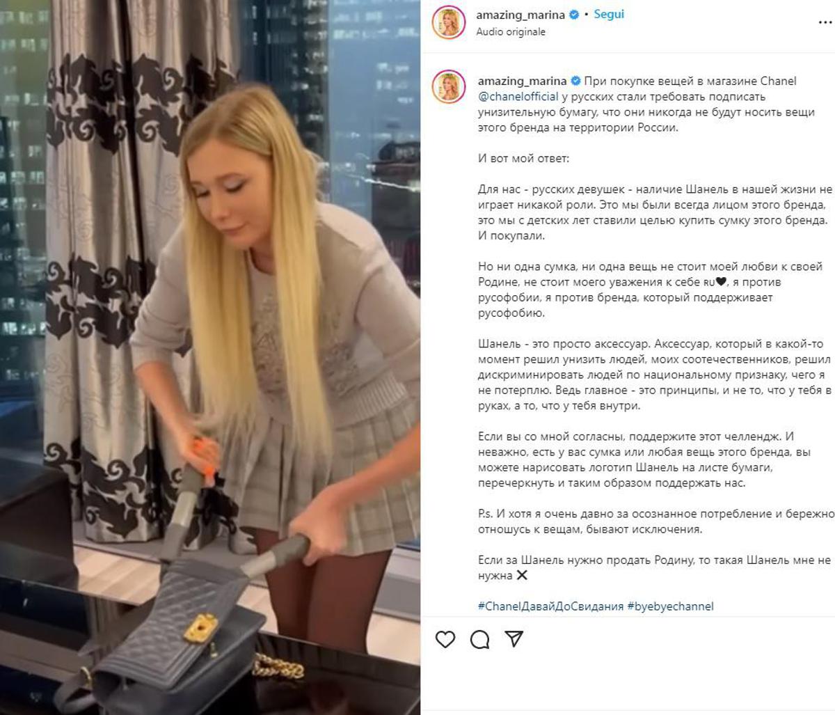 Ermoshkina vive a Mosca, ha studiato e si è laureata a Londra e ha anche vissuto a Milano per un anno. “Io amo l’Italia – dice -. Non solo per la sua bellezza, ma anche perché gli italiani sono molto cordiali e hanno una mentalità positiva molto simile a noi russi. Ma ho sempre amato Mosca, la mia città natale e non vivrei altrove. Ecco perché sono qui”. Dopo il video postato da Ermoshkina su Instagram, dove vanta 300mila follower, altre influencer russe hanno seguito il suo esempio, come la dj Katya Guseva, che si è fatta immortalare mentre fa a pezzi una borsa Chanel o Victoria Bonya che in un video distrugge una borsetta nera della griffe francese dicendo: “Se Chanel non rispetta i propri clienti, perché noi dovremmo rispettare Chanel?”. “Non chiedo alle persone di distruggere le loro borse – sottolinea Marina Ermoshkina – l’obiettivo principale del mio challenge è donare soldi alle vittime del Donbass, dove ci sono persone che stanno soffrendo. Questo è il modo per attirare l’attenzione delle persone sul problema e motivarle a raccogliere fondi per le persone e i bambini nei territori di guerra. E le persone hanno iniziato a donare”.
