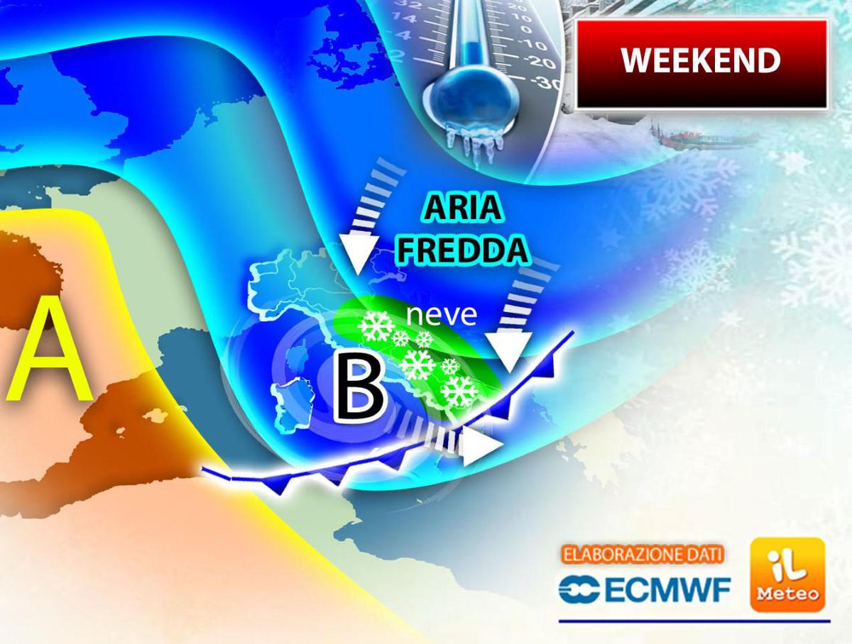Nell’imminente fine settimana aria artica si getterà sul bacino del Mediterraneo generando un vortice ciclonico che piloterà una perturbazione che colpirà principalmente il Centro-Sud. Antonio Sanò, direttore e fondatore del sito www.iLMeteo.it avvisa che dopo un venerdì e un sabato contrassegnati da piogge localmente intense al Sud e dal possibile ritorno di banchi di nebbia in Pianura Padana, da domenica le cose cambieranno ancora. Se al Nord torneranno le nebbie in pianura e nevicherà sui confini alpini fino in valle, al Centro un’intensa perturbazione alimentata e sospinta da aria fredda, già dal mattino raggiungerà dapprima la Toscana per poi trasferirsi su Umbria, regioni Adriatiche, localmente Lazio e quindi al Sud verso sera. Le precipitazioni risulteranno diffuse e a tratti molto forti con la neve che scenderà a quote sempre più basse e fino a rasentare le zone pianeggianti e costiere delle regioni adriatiche in serata e nottata, anche sotto forma di bufera dato che questi settori saranno sferzati da venti intensi. Le temperature continueranno a mantenersi molto basse di giorno mentre di notte saranno le diffuse gelate a far parlare di sé al Nord. I venti soffieranno forti o molto forti dai quadranti settentrionali rendendo i mari molto mossi.