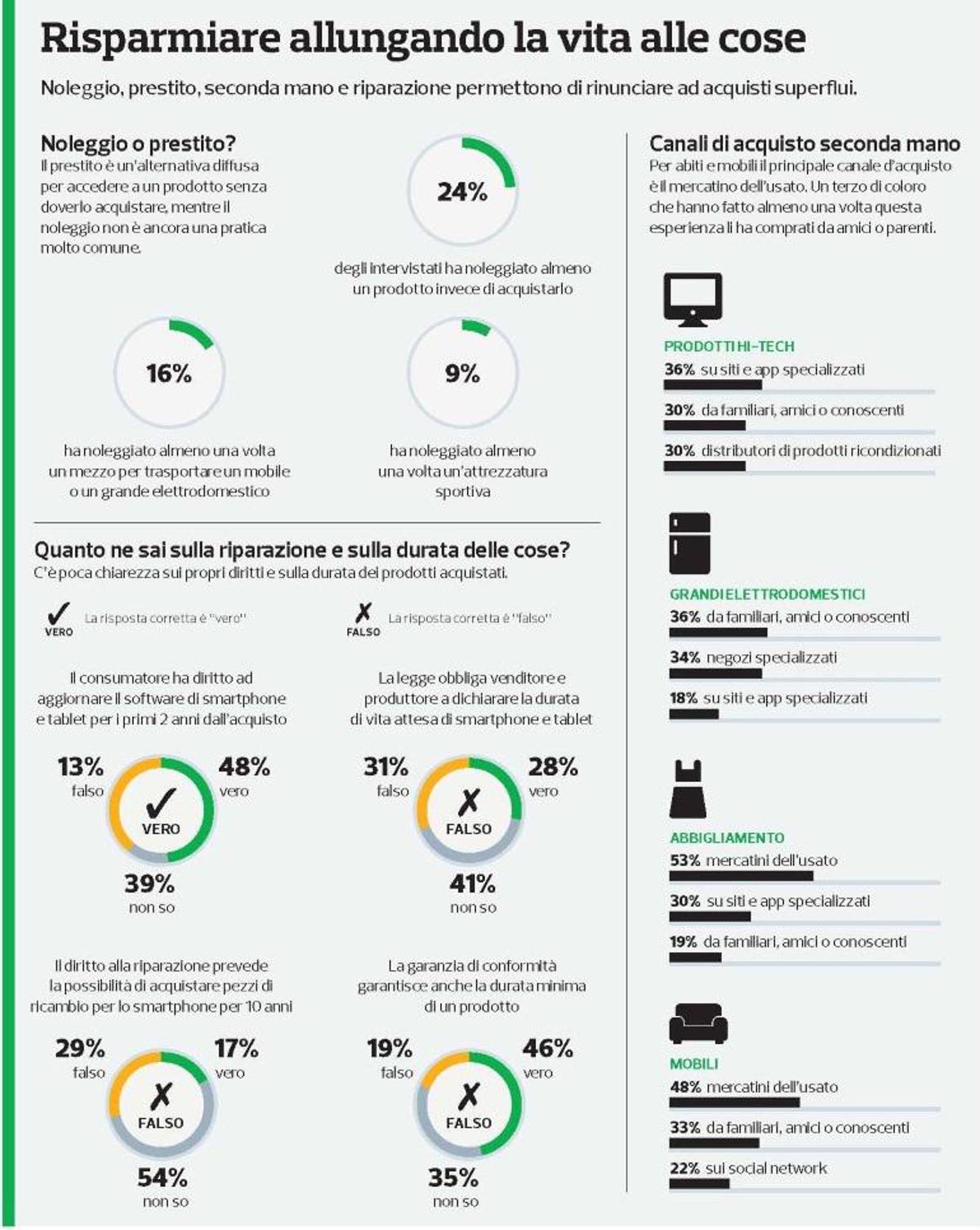 Un’altra strategia per risparmiare e allungare la vita di un bene è la riparazione. La maggior parte dei rispondenti risulta informato su questo: il 70% sa che le istruzioni per manutenzione e riparazione devono essere messe a disposizione, il 60% sa di avere diritto di poter acquistare eventuali pezzi di ricambio. Nonostante ciò, quasi la metà del campione dichiara di non essere al corrente dei propri diritti a riguardo. Sulla garanzia di conformità pare esserci ancora confusione, infatti il 46% pensa che garantisca la durata minima di vita dei prodotti oltre a tutelare il consumatore in caso di acquisto di prodotti difettosi o che non rispondono all’uso dichiarato.