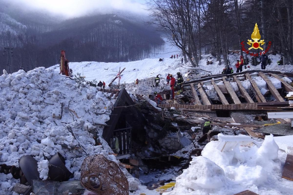 Probabilmente proprio a causa delle scosse, a cui seguirono tutta una serie di repliche nel pomeriggio, intorno alle 17 un blocco di neve e detriti si staccò dalla montagna alle spalle del resort, una struttura moderna, realizzata a quota 1.200 metri sul versante pescarese del Gran Sasso. L’albergo fu completamente travolto: la slavina ne sfondò le pareti e lo spostò di circa dieci metri verso valle. Il bilancio fu pesantissimo: 29 morti e 11 superstiti, miracolosamente sopravvissuti, dopo essere rimasti ore e ore tra le macerie dell’albergo travolto dalla valanga di 1.200 tonnellate che, tagliando la montagna e trascinando via centinaia di alberi, è piombata sulla struttura.
