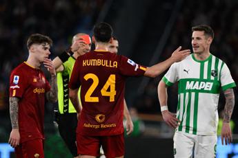 Il francese devia in porta, un pallone quasi banale dopo che Berardi fa il bello e il cattivo tempo sul versante destro dell'area capitolina. La Roma, però, non molla la presa sul match e al 26' trova la rete che la rimette in carreggiata con Zalewski che segna di controbalzo su un lancio in area di Spinazzola. Al 46' in pieno recupero la svolta del match: Berardi conclude e cade. Nella mischia Kumbulla lo scalcia a terra e l'arbitro Fabbri con l'aiuto del Var assegna il calcio di rigore ed espulsione per il difensore. Dagli 11 metri Berardi non sbaglia. La seconda frazione prende il via con la Roma che si ridisegna con il 3-4-2: Dybala e Karsdorp prendono il posto di Bove e Spinazzola. La Joya va subito in gol al 50': grande conclusione a girare del 21 giallorosso su assist di El Shaarawy sulla quale Consigli non può fare nulla. La Roma pressa con forza e costanza ma senza grande precisione, mentre il Sassuolo non riesce a sfruttare gli spazi evidenti che gli avversari, in inferiorità numerica, lasciano liberi. Al 75', però, Pinamonti cala il poker. L'attaccante del Sassuolo sfrutta il pallone in profondità del solito Laurentié per scattare sul filo del fuorigioco e alzare il pallone quel tanto che basta per scavalcare Rui Patricio. Al 78' è ancora Dybala a seminare il panico in solitaria nella retroguardia emiliana: pallonetto dalla distanza che Consigli riesce a deviare in angolo con un gran colpo di reni. Al 95' la Roma segna anche il gol del 3-4 con Wijnaldum che sfrutta un'inserimento di Smalling per superare Consigli in uscita. Non basta e per i giallorossi arriva la sconfitta e niente aggancio al secondo posto in classifica. —sportwebinfo@adnkronos.com (Web Info)