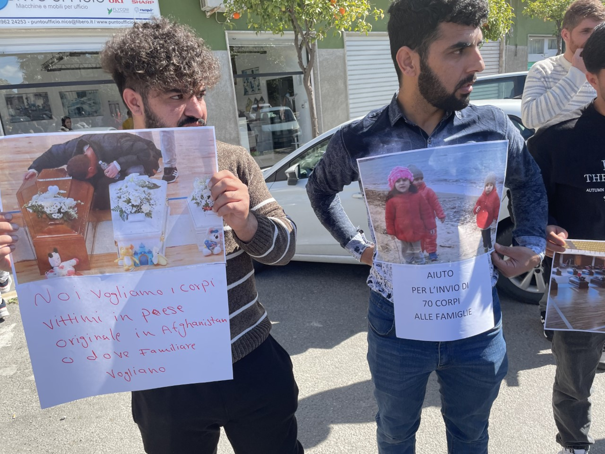 A mezzogiorno la situazione è ancora bloccata. Il sit in prosegue. E anche la protesta. I familiari mostrano striscioni, fotografie, dei loro cari, con nomi e cognomi. C’è chi ha perso la sorella, come Armin, che vive in Germania, o Basir Amini, che ha perso cognata. Storie simili. Tragedie immani. Poi, Alauddin Mohibzada, un ragazzo afghano di 23 anni dagli occhi chiari, che vive dal 2015 in Germania dove fa l’educatore, inizia a chiamare alcune agenzie funebri tedesche. Ma vuole capire chi pagherà questi trasferimenti. Per ore tutto tace. Vanno avanti le trattative, le mediazioni. Il funzionario della Prefettura torna sul posto. Si siede con i familiari a terra. Prova a convincerli. Ma loro vogliono fatti. “Basta con le promesse”, continuano a ripetere. “Vogliamo solo documenti con tanto di firma”.