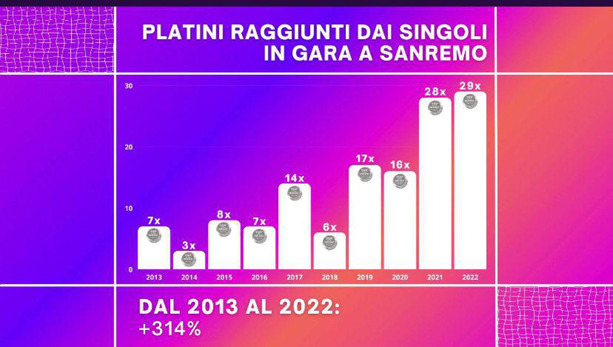 È il dato più alto degli ultimi 10 anni: se si va a ritroso infatti nei festival precedenti le ultime due edizioni firmate da Amadeus svettano sulle precedenti. Se il primo Sanremo di Amadeus nel 2020 si era chiuso con un bilancio di 16 dischi di platino e quello del 2019 condotto da Baglioni con 17 dischi di platino, gli anni precedenti erano ben lontani dai traguardi odierni. Nel 2018 il primo festival di Claudio Baglioni ne aveva ottenuti 6, nel 2017 Carlo Conti aveva totalizzato 14 dischi di Platino con i brani in gara, mentre nel 2016 e nel 2015, sempre il festival di Conti, ne aveva totalizzati rispettivamente 7 e 8. Quello di Fabio Fazio del 2014 ne aveva totalizzati 3 e quello del 2013, sempre condotto da Fazio, ne aveva registrati 7. Insomma, nel giro di 10 anni il bottino di vendite del Festival è aumentato del 314%.