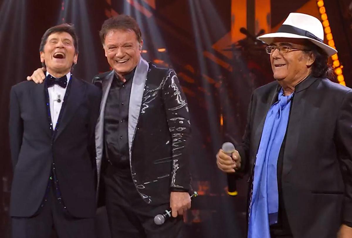Il set si apre con Morandi in galleria che canta ‘In ginocchio da te’. Subito dopo Ranieri dalla platea canta ‘Vent’anni’. A seguire Al Bano entra dalle scale sul palco e canta ‘Nel sole’. Poi Amadeus e Morandi accolgono l’intero trio sul palco.