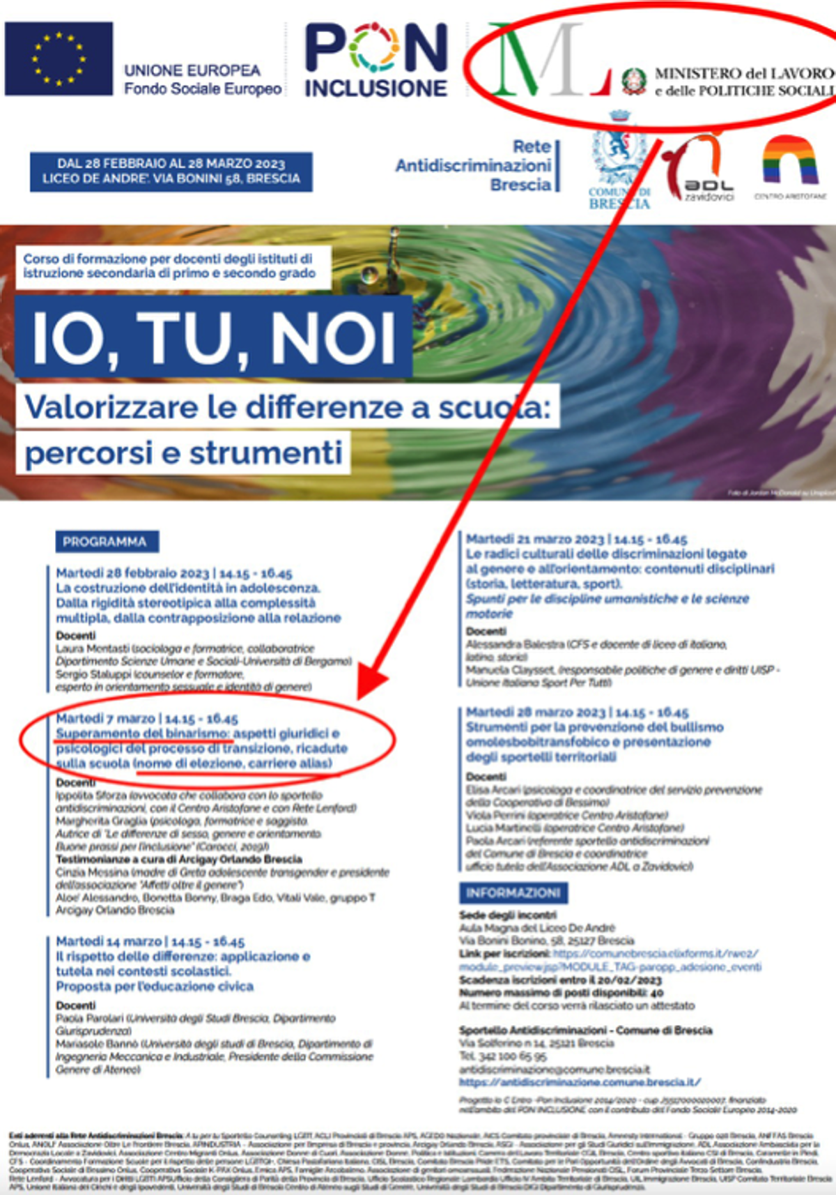 (Adnkronos) – “Gravissimo che il Ministero del Lavoro e l’Ufficio Scolastico Regionale per la Lombardia si facciano promotori di un corso totalmente impregnato di ideologia gender indirizzato ai docenti delle scuole Medie, Licei e altri Istituti secondari di secondo grado di Brescia. Si parlerà di ‘superamento del binarismo’ sessuale, e del ‘processo di transizione e ricadute sulla scuola, nome di elezione, carriere alias'”, dichiara Jacopo Coghe portavoce di Provita e Famiglia Onlus.