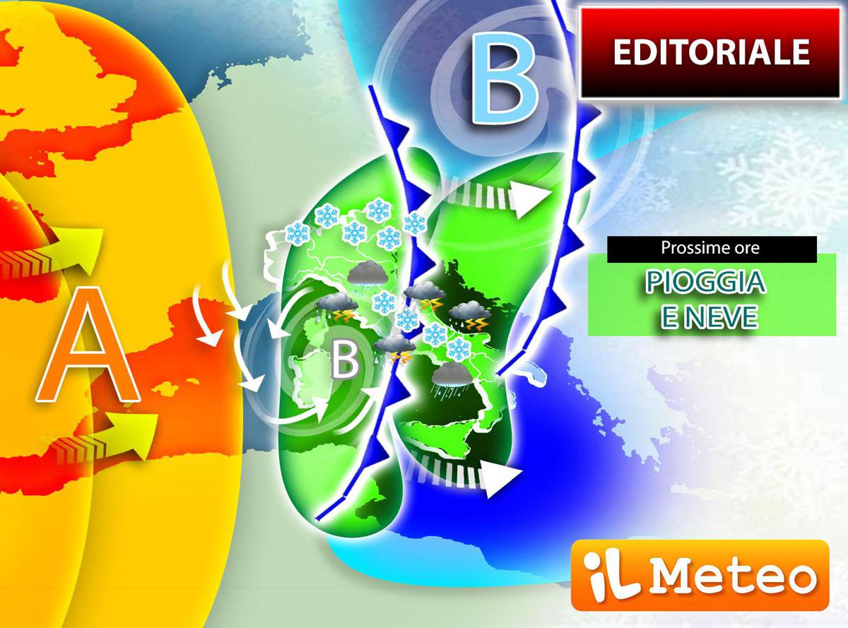 Martedì 15. Al nord: maltempo al nord-est, abbondanti nevicate sulle Alpi orientali, in particolare sul Friuli oltre i 500 metri, neve in pianura in Emilia. Al centro: rovesci sparsi con neve oltre i 1000 metri e venti tesi da ovest. Al sud: giornata di maltempo con piogge e venti forti da ovest.