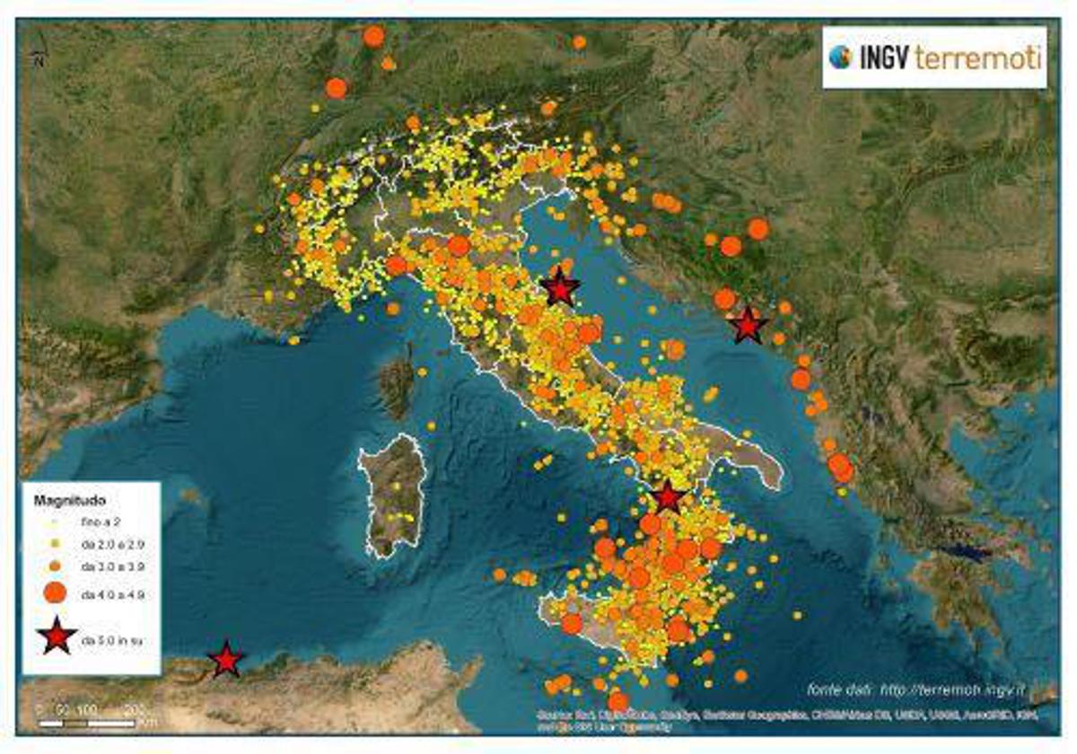 Sempre lo scorso anno l’Ingv ha rilevato 2207 terremoti di magnitudo pari o superiore a 2.0; 258 terremoti di magnitudo compresa tra 3.0 e 3.9; 27 terremoti di magnitudo compresa tra 4.0 e 4.9, 11 dei quali localizzati nei Paesi limitrofi all’Italia (Bosnia-Herzegovina, Albania, Grecia, Malta, Germania), alcuni nei mari circostanti la penisola (Adriatico, Tirreno) e soltanto 4 in terraferma italiana: uno con epicentro in provincia di Agrigento (Mw 4.1), uno in provincia di Catanzaro (Mw 4.3), uno in provincia di Reggio Emilia (Mw 4.3) e uno in provincia di Genova (Mw 4.0). Infine nel 2022 ci sono stati 6 gli eventi di magnitudo superiore o uguale a 5.0, tre dei quali avvenuti al di fuori del territorio italiano (Algeria e Bosnia), uno molto profondo nel Golfo di Policastro, e i due eventi principali della sequenza sismica Mar Adriatico al largo della Costa Marchigiana Pesarese. Il primo di magnitudo Mw 5.5, avvenuto alle 7:07 del 9 novembre, è stato l’evento più forte registrato in Italia nel 2022.