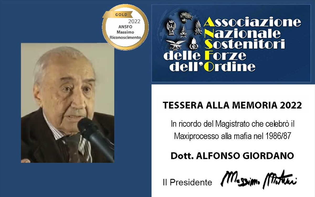 (Adnkronos) – Il Presidente Massimo Martini e il Vice Presidente Ludovico Tabacchi dell’Associazione Nazionale Sostenitori delle Forze dell’Ordine, “con commozione ed orgoglio” , hanno deciso e verbalizzato, di omaggiare i familiari di Alfonso Giordano, Presidente del primo maxiprocesso alla mafia, con la prestigiosa tessera “alla memoria 2022”. Il Presidente Giordano accettò la carica di Presidente della Prima Corte di Assise di Palermo per presiedere il Maxi Processo a Cosa Nostra.