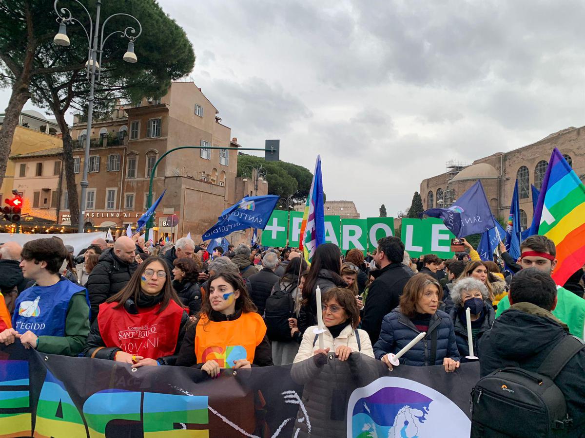 In testa al corteo lo striscione ‘Europe for peace’, retto dal sindaco Roberto Gualtieri, dal segretario della Cgil Maurizio Landini e dal fondatore di Sant’Egidio Andrea Riccardi.