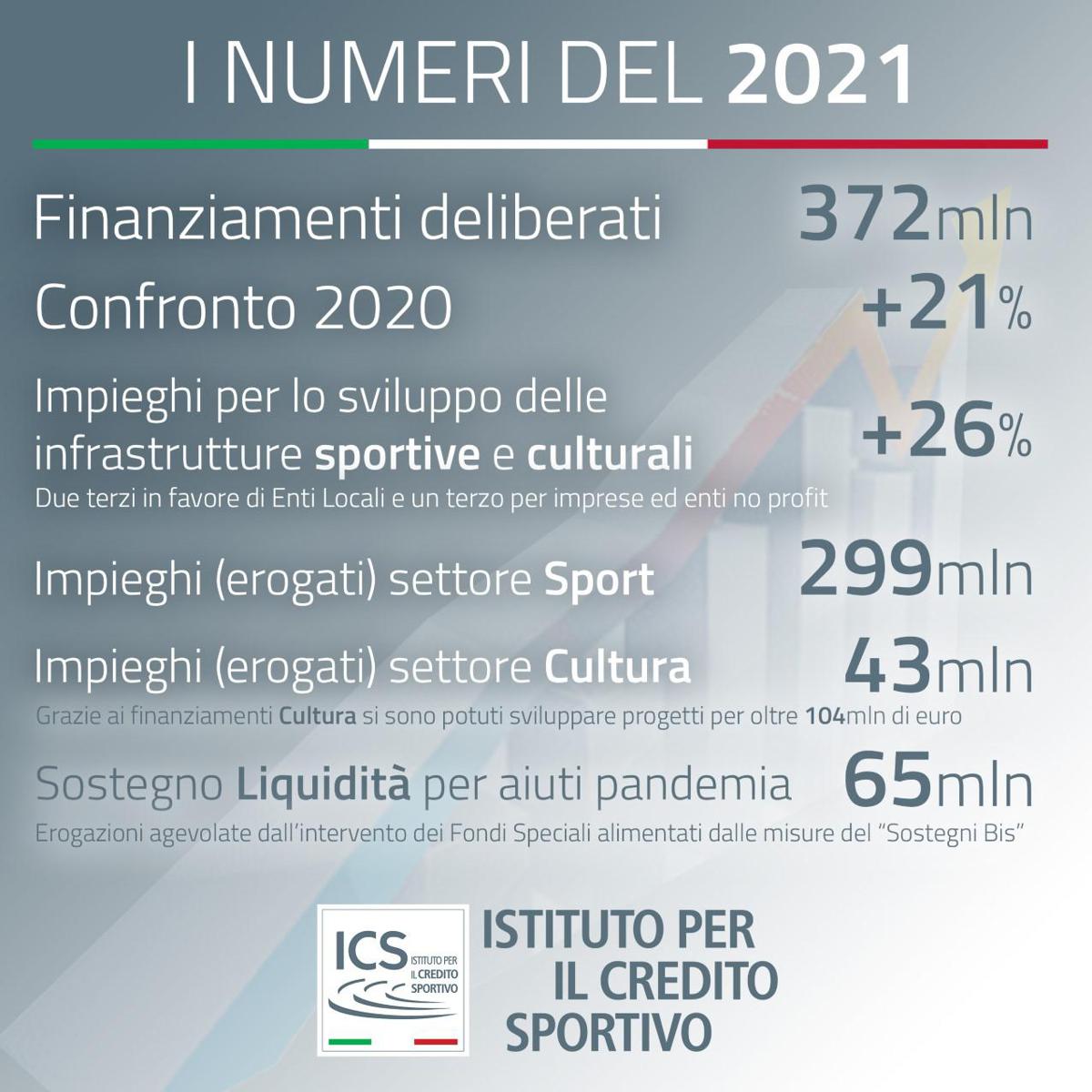 Un 2021 in crescita per l’Istituto per Il Credito Sportivo (Ics), che ha chiuso l’anno con numeri eccellenti, confermando una tendenza positiva già manifestata nell’esercizio 2020. L’Ics, Banca sociale per lo sviluppo sostenibile dell’Italia attraverso lo Sport e la Cultura, ha raggiunto un nuovo record sia in relazione alle erogazioni dei finanziamenti, 342 milioni di euro (+6%) rispetto al 2020, sia relativamente agli importi deliberati che si attestano a 372 milioni di euro di nuovi affidamenti, in rilevante crescita di circa 63,8 milioni di euro (+21%) rispetto al 2020. Rilevante, in particolare, la spinta degli impieghi per lo sviluppo infrastrutturale sportivo e culturale, che hanno raggiunto i 277 milioni di euro, con una crescita di circa 58 milioni di euro (+26%) rispetto al risultato del 2020, dei quali circa i due terzi sono stati a favore di Enti Locali e un terzo per imprese ed enti no profit.