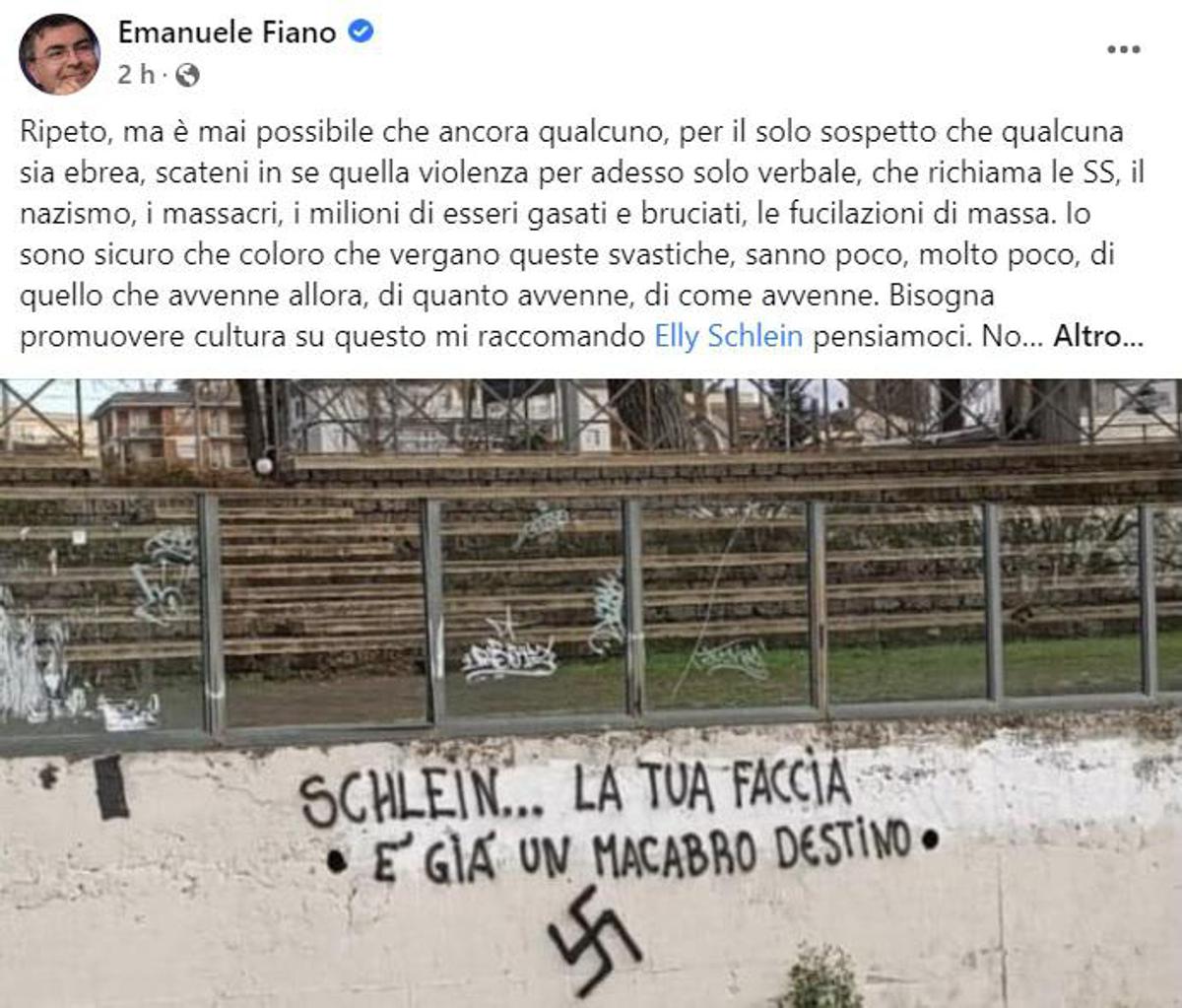 “Ripeto, ma è mai possibile che ancora qualcuno, per il solo sospetto che qualcuna sia ebrea, scateni in se quella violenza per adesso solo verbale, che richiama le SS, il nazismo, i massacri, i milioni di esseri gasati e bruciati, le fucilazioni di massa – il post di Emanuele Fiano su Facebook – Io sono sicuro che coloro che vergano queste svastiche, sanno poco, molto poco, di quello che avvenne allora, di quanto avvenne, di come avvenne. Bisogna promuovere cultura su questo mi raccomando Elly Schlein pensiamoci. Non lasciamo niente di intentato. Ogni rigurgito va curato, represso certo, ma deve anche essere oggetto di un nuovo investimento culturale ed educativo nel nostro paese, per trasmettere la lezione del male e trasformarla in bene. Solidarietà ad Elly Schlein. Se non ora quando?”.